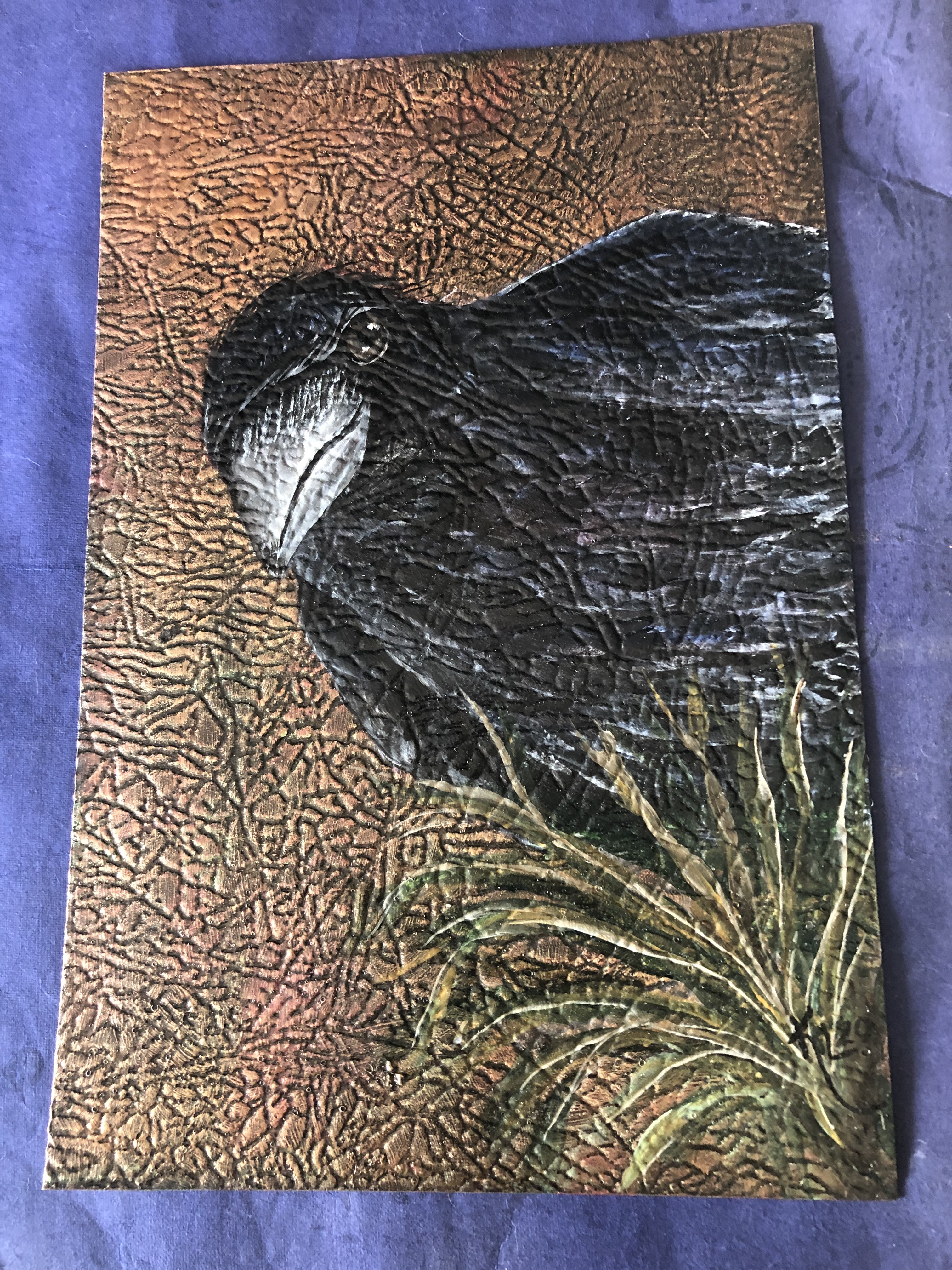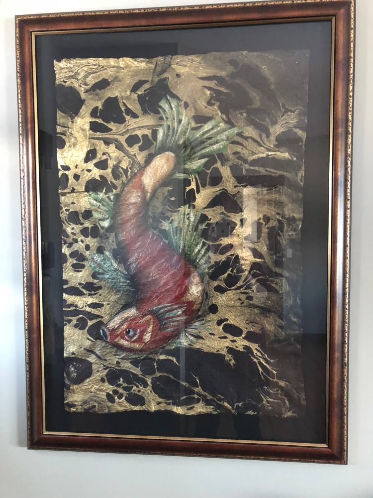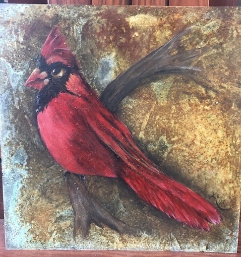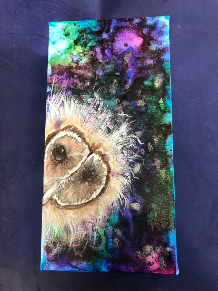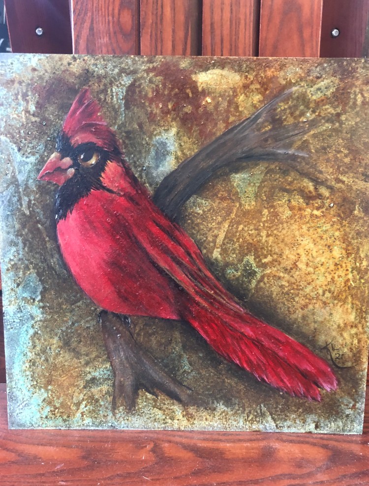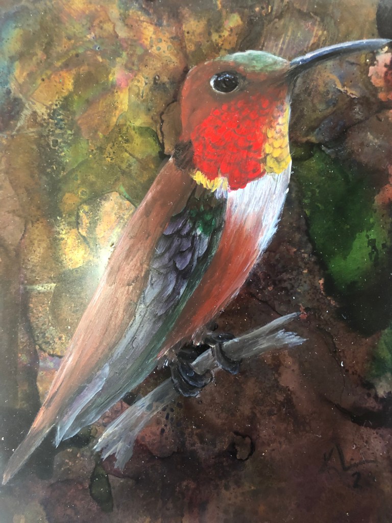 I work with gold leaf, acrylics, metallics, alcohol inks, foils and glazes on all sorts of different surfaces — copper, aluminum, slate, canvas, suede, glass, mulberry paper, wood, parchment paper. Anything that doesn’t move!